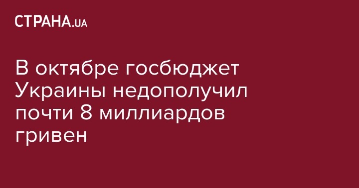 Государственный бюджет Украины за октябрь 2019 года получил 70,992 миллиардов гривен доходов, что на 7,836 миллиардов (или на 9,9%) меньше планового показателя. Об этом говорят данные, опубликованные на сайте Государственной казначейской службы Украины.