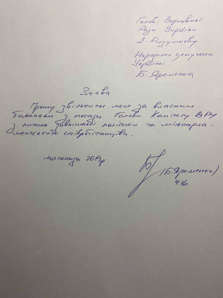 При этом Яременко не указал точную дату заявления, написав: "ноября 2019". Вероятно, предполагая ее проставить после решения фракции.