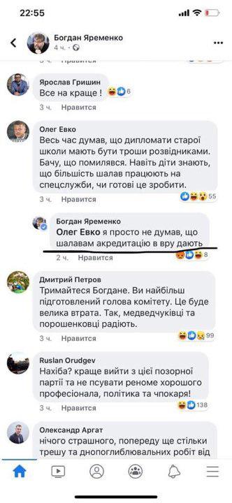 Один из комментаторов под постом Яременко о сложении полномочий главы комитета Рады написал: "Все время думал, что дипломаты старой школы должны быть немножко разведчиками. Вижу, что ошибался. Даже дети знают, что большинство шалав работают на спецслужбы, или готовы это сделать."