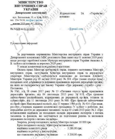 Согласно выписке Департамента коммуникаций МВД Украины, зарплата Сергея Ярового, первого зама Авакова, составила 83911 грн, заместителей Сергея Гончарова – 89655 грн, Татьяны Ковальчук – 89655 грн, Вадима Трояна – 14661 грн, государственного секретаря Алексея Тахтая – 68062 грн.