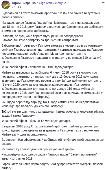 Исполнительный директор "Нафтогаза" Юрий Витренко сообщил, что компания направила в Стокгольмский арбитражный суд встречный иск против "Газпрома" на $12 млрд. Об этом он написал в своем Facebook.