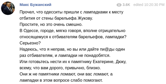 "Прочел, что одесситы пришли с лампадками к месту отбития от стены барельефа Жукову. Простите, но это очень смешно. В Одессе, городе, мягко говоря, вполне отрицательно относящемуся к отбивателям барельефов, лампадки? Серьезно? Надеюсь, что я неправ, но вы или дайте пи@ды один раз отбивателям, и лампадки не понадобятся. Или готовьтесь нести их к памятнику Екатерине, Дюку, всему, что вам дорого, привычно, близко. Они ж не памятники ломают, они вас ломают, а лампадки в этом вопросе слабо помогают", - написал Бужанский.