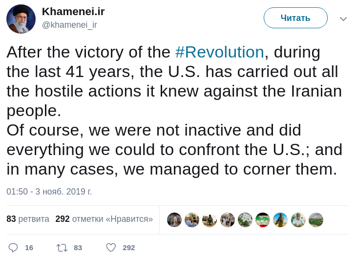 "После победы исламской революции на протяжении 41 года США предпринимали враждебные действия против иранского народа. Конечно, мы не бездействовали и делали все, чтобы противостоять США, и во многих случаях нам удалось загнать их в угол", - написал он в воскресенье.