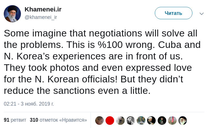 "Кое-кто полагает, что переговоры решат все проблемы. Это на 100% неправда, - отметил Хаменеи. - Перед нами опыт Кубы и Северной Кореи. Они фотографировались и даже выражали любовь к северокорейским чиновникам! Но они даже не ослабили санкции", - добавил аятолла.