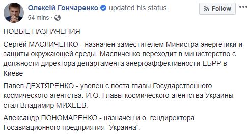 По его данным, Сергей Масличенко назначен заместителем Министра энергетики и защиты окружающей среды. Масличенко переходит в министерство с должности директора департамента энергоэффективности ЕБРР в Киеве.