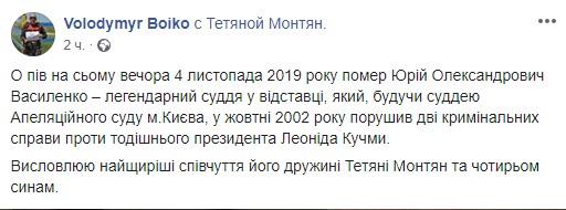 "В половине седьмого вечера 4 ноября 2019 года скончался Юрий Александрович Василенко-легендарный судья в отставке, который, будучи судьей Апелляционного суда г. Киева, в октябре 2002 года возбудил два уголовных дела против тогдашнего президента Леонида Кучмы. Выражаю самые искренние соболезнования его жене Татьяне Монтян и четырем сыновьям", - написал Бойко.