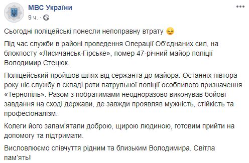 "Во время службы в районе проведения операции Объединенных сил на блокпосту "Лисичанск – Горное" умер 47-летний майор полиции Владимир Стецюк. Полицейский прошел путь от сержанта до майора. Последние полтора года нес службу в составе роты патрульной полиции особого назначения "Тернополь". Вместе с побратимами неоднократно выполнял боевые задачи на востоке государства, где всегда проявлял мужество, стойкость и профессионализм ", – сообщили на странице МВД.