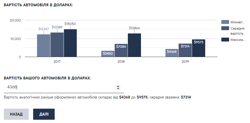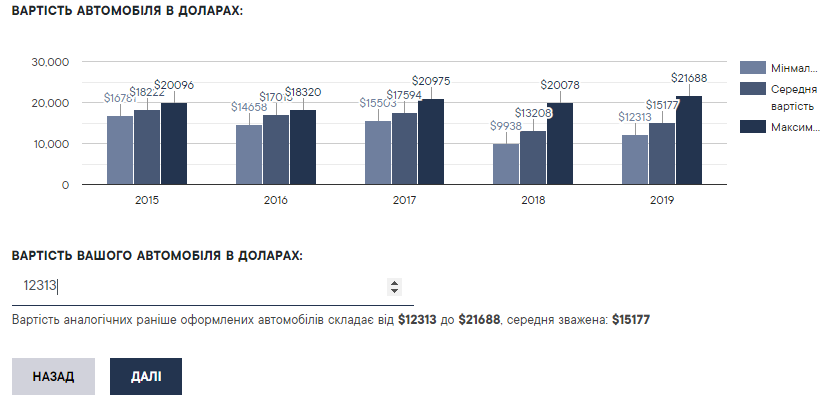 Как видим, калькулятор сам задает оценку автомобиля минимально 12 313 долларов (с учетом уровня цен на рынке, а не технических параметров авто).
