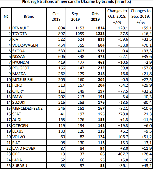 Статистика продаж автомобилей в Украине в октябре 2019 года Фото: ukrautoprom.com.ua