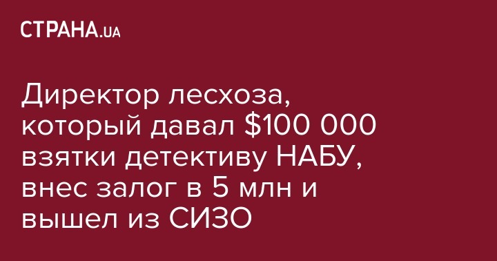 Также читайте о том, что как директора лесхоза взяли на взятке в $100 тыс. Взятку следователю НАБУ предложили за закрытие дела, которое связано с незаконным отчуждением неучтенного имущества и продажей лесоматериалов по сниженным ценам подконтрольным директору предприятиям.