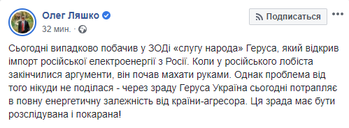"Сегодня случайно увидел в ЗОДе слугу народа Геруса, который открыл импорт российской электроэнергии из России. Когда у российского лоббиста закончились аргументы, он начал махать руками. Однако проблема от того никуда не делась - из-за измены Геруса Украина сегодня попадает в полную энергетическую зависимость от страны-агрессора. Эта измена должна быть расследована и наказана!", - написал Ляшко в Facebook.