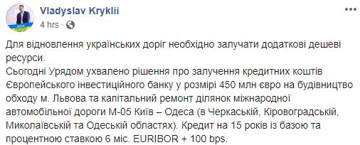 По его словам, в среду, 6 ноября, правительство приняло решение о привлечении кредитных средств Европейского инвестиционного банка в размере EUR 450 млн на строительство обхода г.Львова и капитальный ремонт участков международной автомобильной дороги М-05 Киев-Одесса (в Черкасской, Кировоградской, Николаевской и Одесской областях).