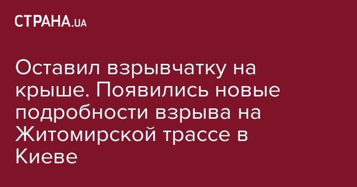 Взрыв автомобиля на Житомирской трассе, который случился поздно вечером 6 ноября, произошел в результате детонации взрывного устройства на крыше. Как нам рассказал источник в правоохранительных органах, бомбу на крыше оставил мотоциклист, проезжающий рядом.