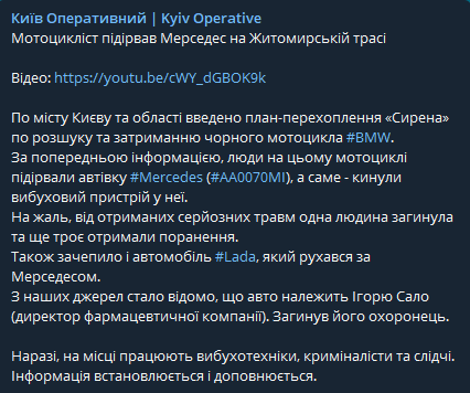 Автомобиль Mercedes, который взорвал мотоциклист на Житомирской трассе в Киеве, принадлежит директору фармацевтической компании Игорю Сало. Об этом сообщает Киев Оперативный со ссылкой на свои источники.
