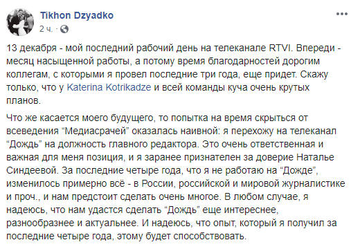 Журналист телеканала RTVI Тихон Дзядко подтвердил, что в декабре 2019 года займет пост главного редактора российского оппозиционного телеканала "Дождь". Об этом он написал на своей странице в Facebook.