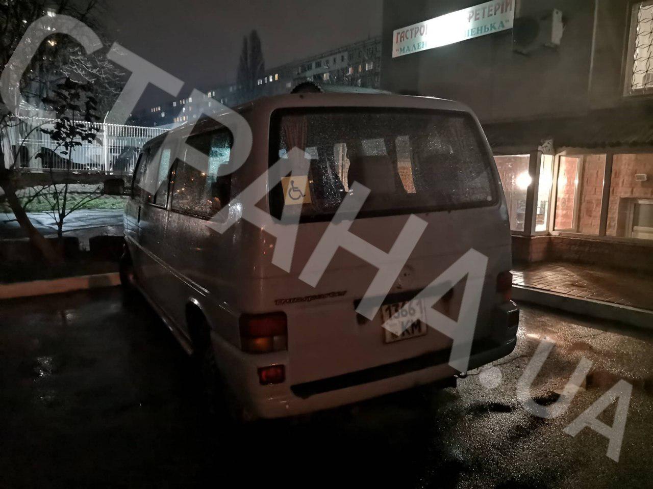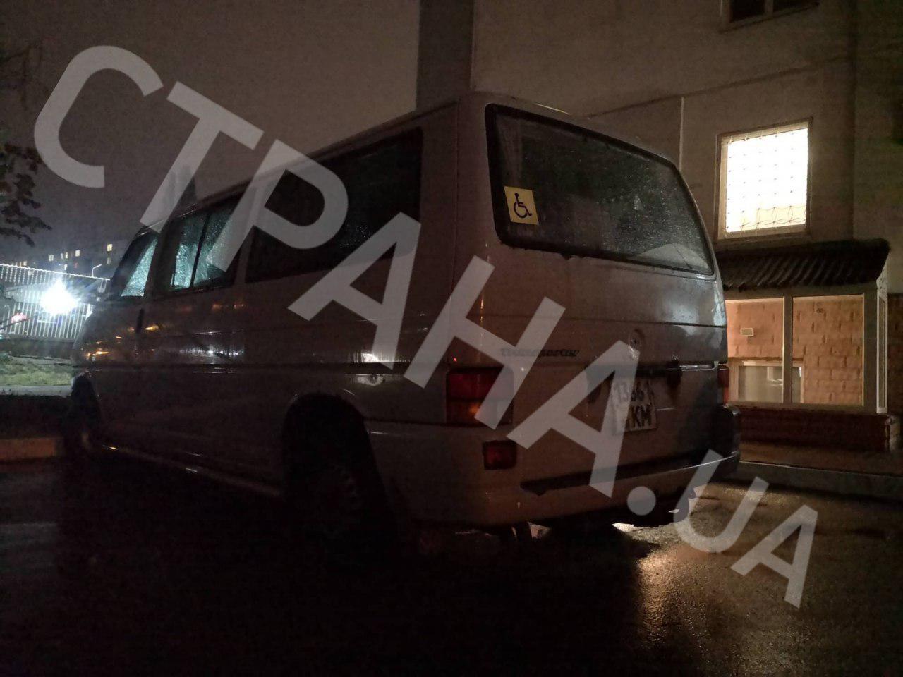 Жители дома рассказали, что недавно у автомобиля Алексея кто-то ночью пробил колесо. И действительно, левое заднее колесо на машине оказалось спущено. Машину "святошинского стрелка" узнать легко: это белый "бусик" со значком "инвалид".