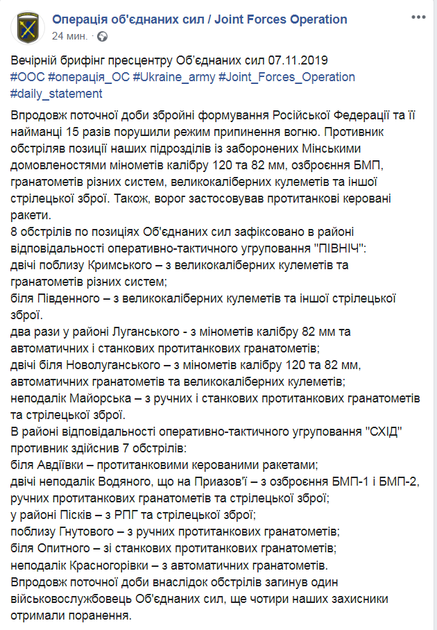 В сводке говорится, что противник обстрелял позиции наших подразделений из запрещенных Минскими договоренностями минометов калибров 120 и 82 мм, вооружения БМП, гранатометов разных систем, крупнокалиберных пулеметов и другого стрелкового оружия. Также враг применял противотанковые управляемые ракеты.