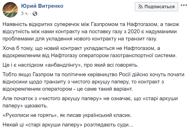 "Наличие открытых споров между "Газпромом" и "Нафтогазом", а также отсутствие между нами контракта на поставку газа с 2020 года являются надуманными проблемами для заключения нового контракта на транзит газа", - говорится на fb-странице исполнительного директора "Нафтогаза Украины" Юрия Витренко в пятницу, 8 ноября.