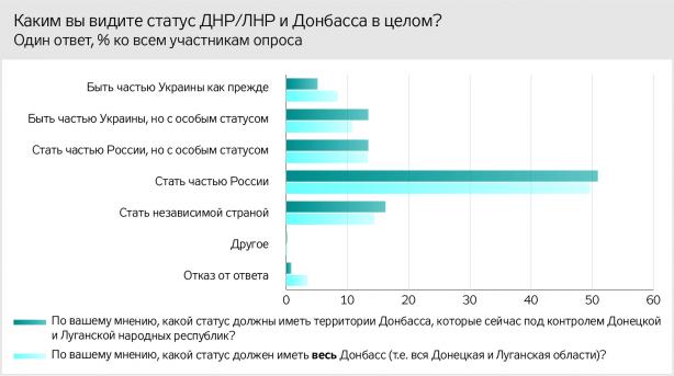 Издание "Зеркало недели" провело опрос среди жителей неподконтрольных территорий Донбасса относительно того, каким они видят будущее Луганска и Донецка в случае окончания войны. Опрос показал, что только 5% хотят вернуться в состав Украины, а 65% считают, что территория "республик" должна стать частью Росии.