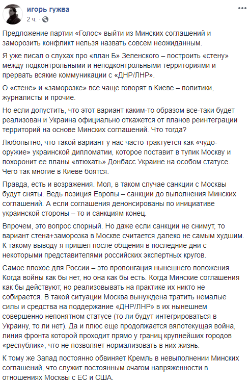Об этом давно говорят у Зеленского (как он сам, так и министр иностранных дел Вадим Пристайко). Вчера с требованием выйти из Минских соглашений и заморозить конфликт на Донбассе выступила партия "Голос".