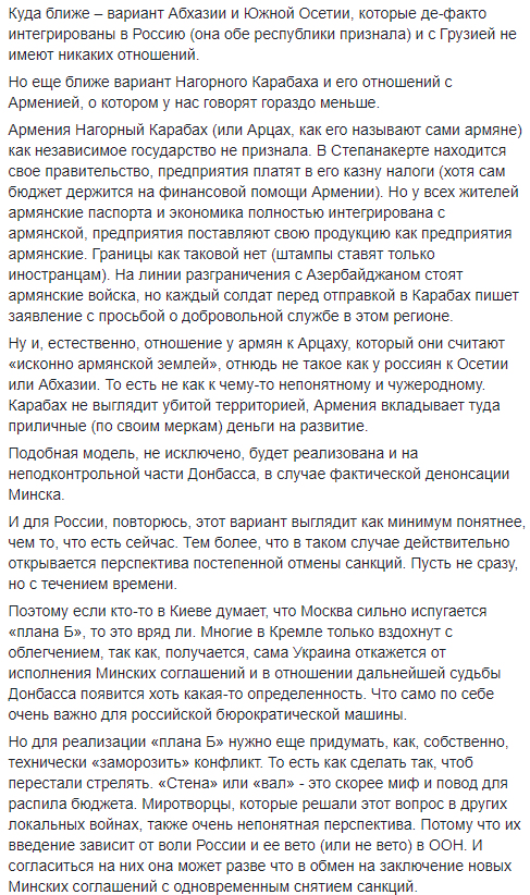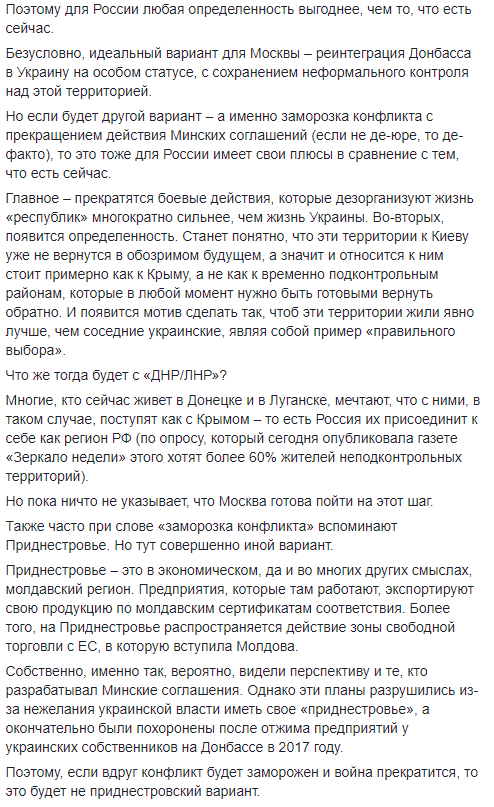Но если будет другой вариант – а именно заморозка конфликта с прекращением действия Минских соглашений (если не де-юре, то де-факто), то это тоже для России имеет свои плюсы в сравнение с тем, что есть сейчас.