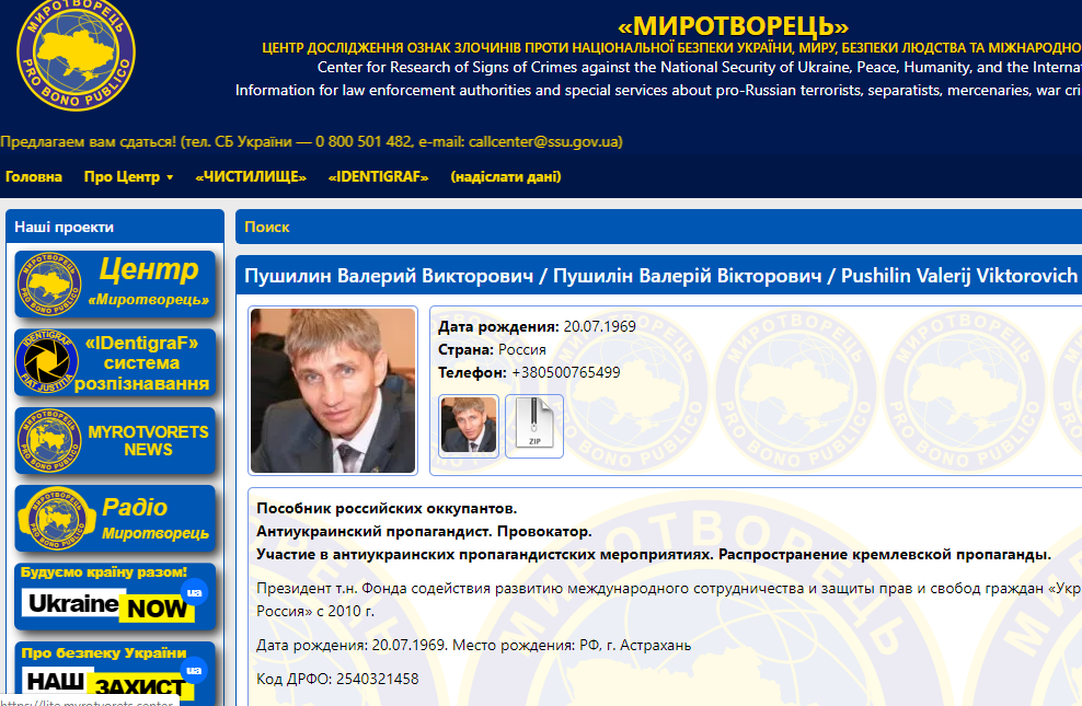 Президента фонда Украина-Россия Валерия Пушилина внесли на "Миротворец" за его комментарий в поддержку президента Владимира Зеленского, который опубликовала "Страна".
