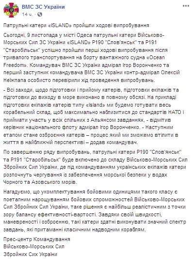 "Все мероприятия по подготовке и приему катеров, подготовки экипажей и подготовки к выходу в море выполнено в полном объеме. На примере подготовки экипажей катеров типа "Island" мы будем готовить весь корабельный состав, чтобы максимально приблизиться к стандартам НАТО и принимать участие во всех совместных с НАТО задачах", - сказал руководитель национального флота адмирал Игорь Воронченко.