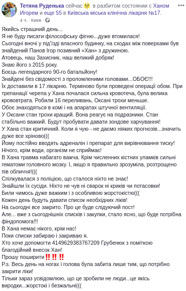 "Сегодня ночью в подъезде собственного дома, на лестнице между этажами был найден Панов Игорь, позывной "Хан" с женой... боец ​​легендарного 90-го батальона. Найдены без сознания с проломленными головами", - рассказала волонтер.