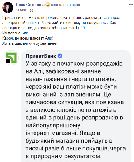 В сети жаловались на работу Привата и вечером. Клиентам присылали разъяснения, что это связано с Алиэкпрессом и массовым ажиотажем, которое вызвало нагрузку. В банке сообщали, что трудности временные и платежи будут проведены, но с опозданием.