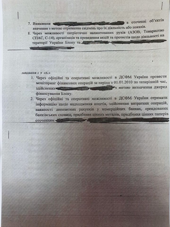 Также в плане указано, что для получения информации можно использовать возможности националистических организаций Азов, Товарищество СПАС и С-14. Кроме того, с помощью Государственной службы финансового мониторинга оперативники должны были добыть информацию о счетах нардепов.