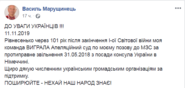 Защита дипломата Василия Марущинца 11 ноября выиграла Апелляционный суд по его иску к Министерству иностранных дел Украины за "противоправное" увольнение 31 мая 2018 года с должности консула Украины в Германии. Об этом сам Марущинец, известный своими ксенофобскими взглядами, написал в Facebook.