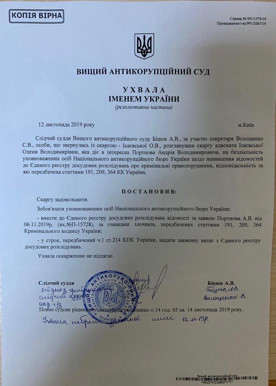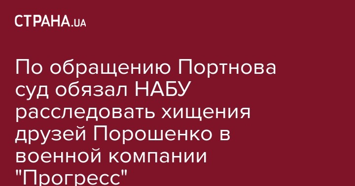 Юрист Андрей Портнов заявил, что Высший антикоррупционный суд (ВАКС) по его обращению обязал 12 ноября Национальное антикоррупционное бюро (НАБУ) начать расследование хищений окружением Петра Порошенко 34 млн грн из военной компании "Прогресс". Об этом адвокат написал в своем Telegram и опубликовал скан соответствующего распоряжения ВАКС.