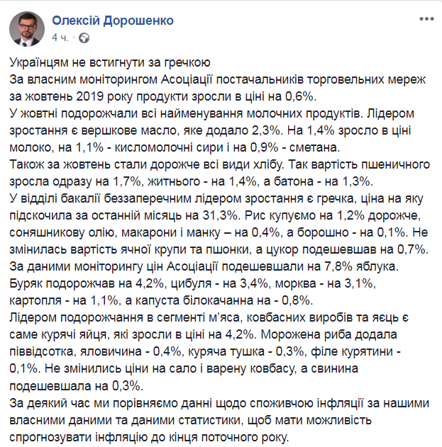 Согласно данным мониторинга, проведенного Ассоциацией поставщиков торговых сетей, в октябре 2019 года продукты в Украине выросли в цене на 0,6%. Об этом сообщил на Facebook глава Ассоциации Алексей Дорошенко.
