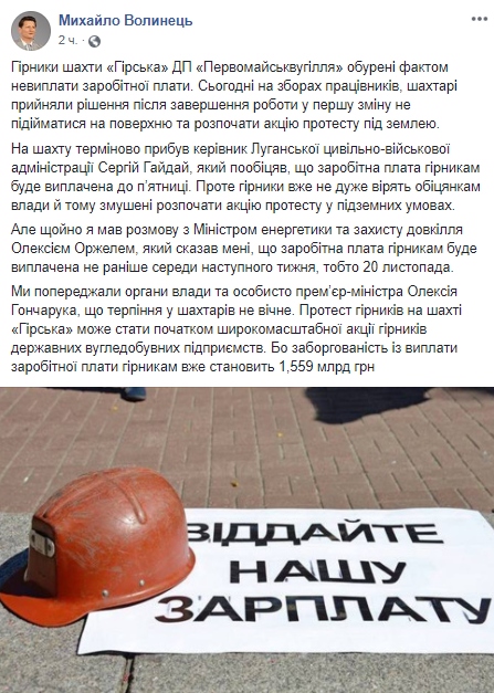 По словам автора поста, зарплату горнякам выплатят не ранее среды следующей недели, 20 ноября. Об этом стало известно после разговора Михаила Волынца с министром энергетики и защиты окружающей среды Алексеем Оржель.