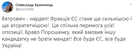 "Вятрович - нардеп! Фракция ЕС станет еще сильнее и еще аторитетнее Это общая победа всей оппозиции. Браво Порошенко, который уговорил другую кандидатку не брать мандат! Все будет ЕС, все будет Украина!" - написал экс-нардеп от БПП Александр Бригинец.