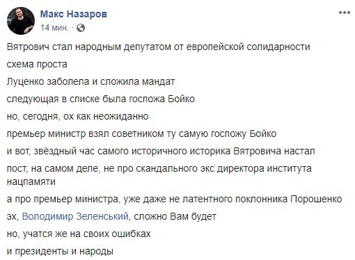 Ту же тенденцию подметил телеведущий Макс Назаров: "Вятрович стал народным депутатом от Европейской солидарности. Схема проста. Луценко заболела и сложила мандат, следующая в списке была госпожа Бойко. Но сегодня, ох как неожиданно, премьер министр взял советником ту самую госпожу Бойко (на самом деле она работала у Гончарука еще с сентября - Ред.). И вот, звёздный час самого историчного историка Вятровича настал.