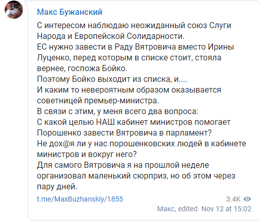 "Сегодняшнее продвижение по списку ЦИК во фракцию Порошенко одиозного рогуля Вятровича, состоявшееся благодаря подковерному назначению одного из членов партии Порошенко на работу к премьеру Гончаруку ещё раз подтверждает слова, что мы имеем дело с реальной коалицией двух, а не одной политических сил - Слуги Народа и ЕС Порошенко.