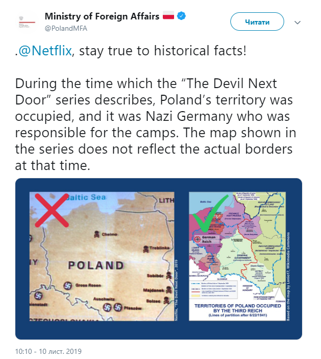 Премьер-министр Польши написал письмо в компанию Netflix, потребовав изменить документальный фильм об украинском надзирателе Иване Демьянюке и нацистских лагерях смерти "Дьявол по соседству" (The devil Next Door), действовавших во время Великой Отечественной Войны. Об этом передает ВВС Украина.