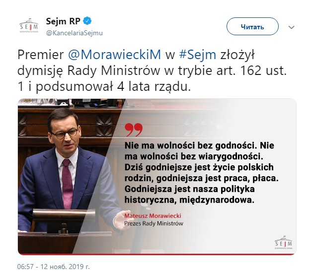 Как отмечается, согласно конституции Польши, Моравецкий подал прошение об отставке во время первого заседания нижней палаты парламента. Премьер-министр также подвел итоги четырех лет деятельности кабмина, отметив, что работа правительства способствовала повышению благополучия населения, увеличению расходов на здравоохранение и мер по поддержке молодежи.