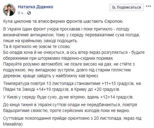 Синоптик Наталья Диденко написала в Facebook, что в среду, 13 ноября температура составит +11...+15 градусов, на юге и западе +14... +19 градусов, в Крыму до +20 градусов. В Киеве в среду будет сухо, очень ветрено, днем +12...+14 градусов.