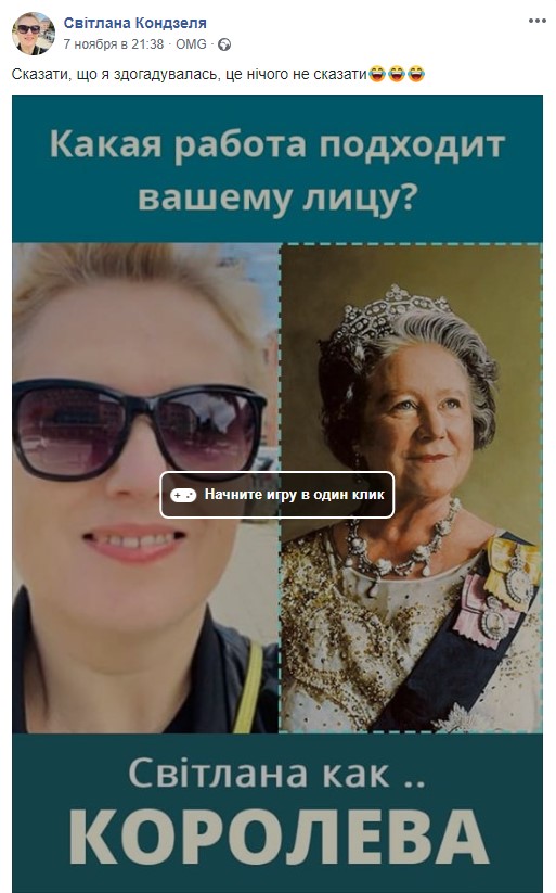 При этом Светлана не стесняется в шутку сравнивать себя с самой королевой, размещая у себя на стене скрин из игры, где по фото лица определяется, какая работа подходит больше всего. Как выяснилось, "Светлана как... королева".