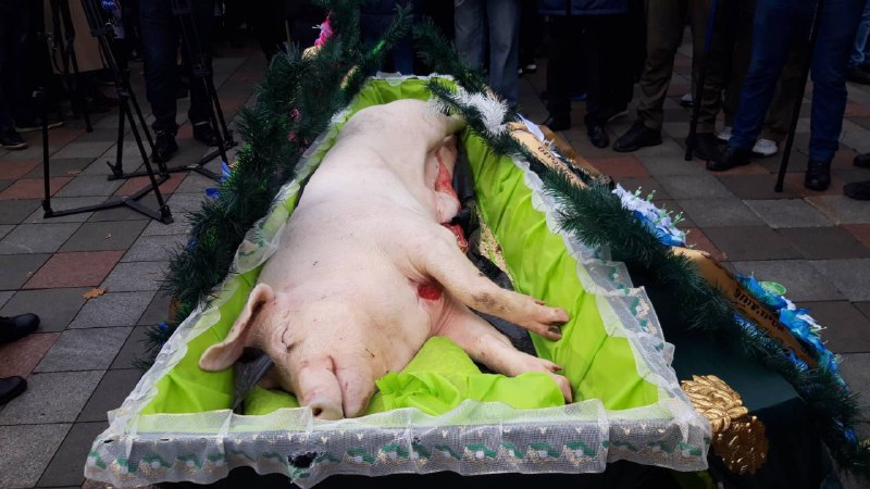 Протестующие принесли по Раду свинью в гробу и заявляют, что она символизирует убийство украинских фермеров агрохолдингами.