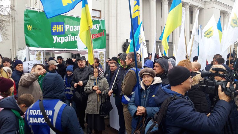 Когда началось заседание ВР протестующие отошли от входов. Они сканируют " Нет продажи украинской земли".