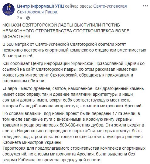 Территория для предполагаемого строительства комплекса спортивных сооружений, по словам митрополита Арсения, была выделена без ведома Кабмина во времена предыдущей власти.
