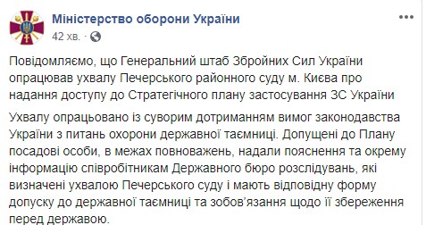 В Генеральном штабе Вооруженных сил Украины (ВСУ) обработали решение Печерского районного суда Киева о представлении доступа следователям Госбюро расследований (ГБР) к стратегическому плану применения армии. Об этом заявили в пресс-службе Минобороны в Facebook.