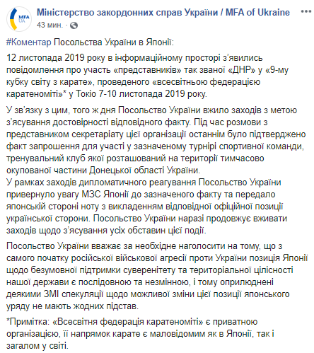 Также украинские дипломаты уточнили, что огранизатор соревнований "Всемирная федерация каратеномити" - частная организация. Ее направление каратэ является малоизвестным как в Японии, так и в целом в мире.