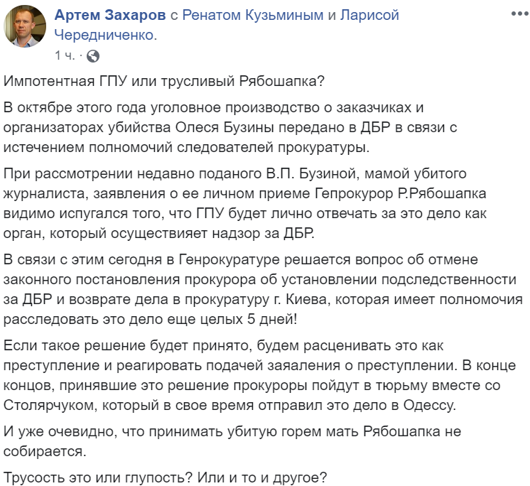 "При рассмотрении недавно поданого В. П. Бузиной, мамой убитого журналиста, заявления о ее личном приеме Гепрокурор Рябошапка видимо испугался того, что ГПУ будет лично отвечать за это дело как орган, который осуществляет надзор за ГБР.