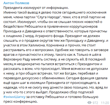 "Президента изолируют от информации. Именно такой вывод я делаю после сегодняшнего исключения меня, члена партии "Слуга Народа", теми, кто в этой партии не состоит. Изолируют, чтобы он не слышал плохих новостей о бездействии Рябошапки в привлечении коррупционеров Приходька и Давиденка к ответственности, которые причастны к хищению 2 млрд. Аграрного фонда. Президент не должен слышать и о продаже округов тем же Приходьку и Давиденку, и участии в этом Халимона, Корниенка и прочих. Не стоит расстраивать его и вопросами. Удобнее же говорить о заговоре врагов и причастности к этому, такого как я. Только я шел в Верховную Раду менять систему, а не служить ей. В последний месяц я неоднократно пытался встретиться с Президентом и рассказать о всем, что происходит. Меня всячески не допускали к нему, а при общих встречах, тот же Богдан, перебивал и переводил дискуссию с обвинениями. Сегодня фракция сделала еще один шаг в изоляции президента от происходящего, в надежде, что я не смогу ему донести свою позицию. Но, вряд ли у них что-то с этого выйдет. Продолжаю сбор подписей #знімиШапку за отставку Рябошапки и готовлю большую пресс-конференцию" - заявил Поляков.