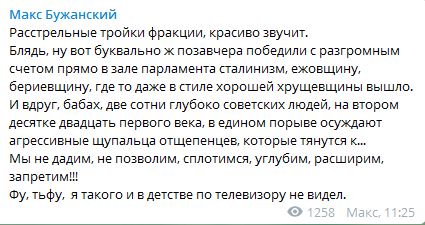 "Расстрельные тройки фракции, красиво звучит. Б@@@@, ну вот буквально ж позавчера победили с разгромным счетом прямо в зале парламента сталинизм, ежовщину, бериевщину, где-то даже в стиле хорошей хрущевщины вышло. И вдруг, бабах, две сотни глубоко советских людей, на втором десятке двадцать первого века, в едином порыве осуждают агрессивные щупальца отщепенцев, которые тянутся к... Мы не дадим, не позволим, сплотимся, углубим, расширим, запретим!!!", - написал он.