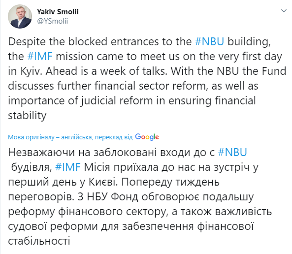 "Несмотря на заблокированные входы в здания НБУ миссия МВФ в первый же день в Киеве пришла к нам на встречу. Впереди - неделя переговоров. С НБУ Фонд обсуждает дальнейшую реформу финсектора, а также важность судебной реформы в обеспечении финансовой стабильности", - написал Смолий.